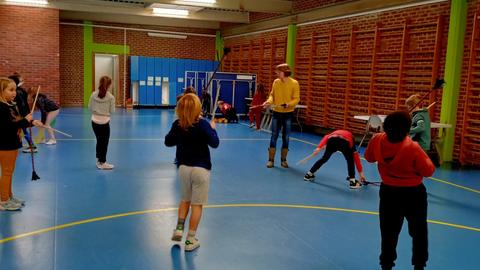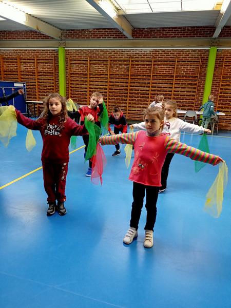 Ateliers cirque pour les CE1 cette période : équilibre sur la boule, le rolla bolla et les pédarols, jonglerie avec des bâtons du diable et des foulards.